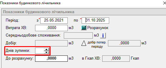 2. Питання щодо внесення кількості днів зупинки при внесенні показників будинкового лічильника: