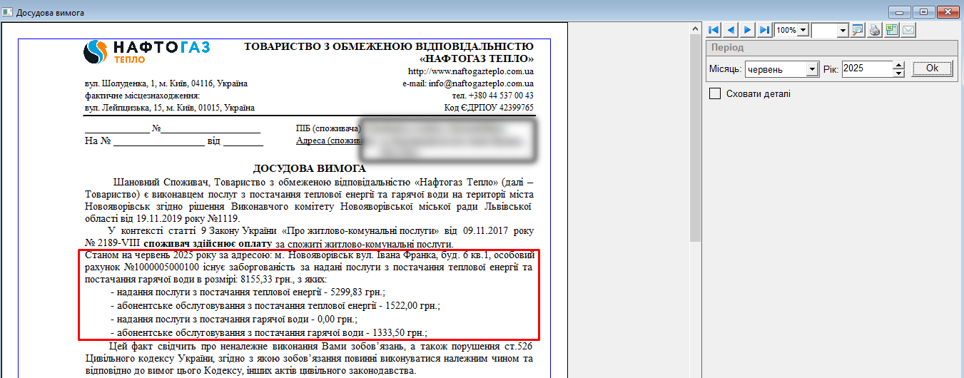 Якщо за обраний період загальна сума по послугам 0 або переплата, досудова вимога у такому випадку не формується.