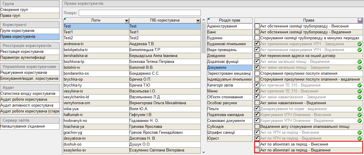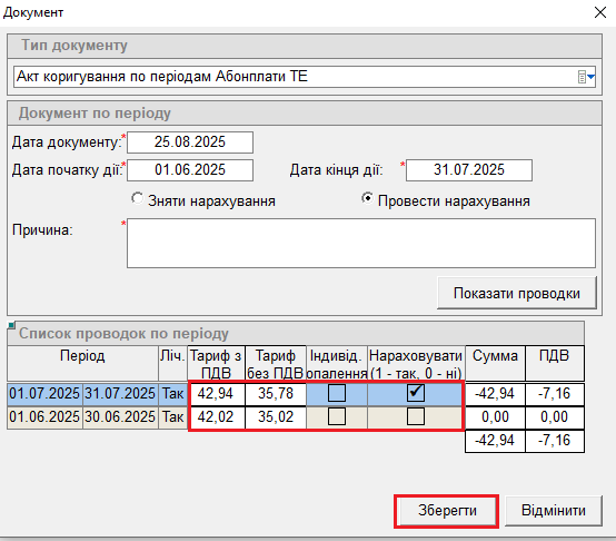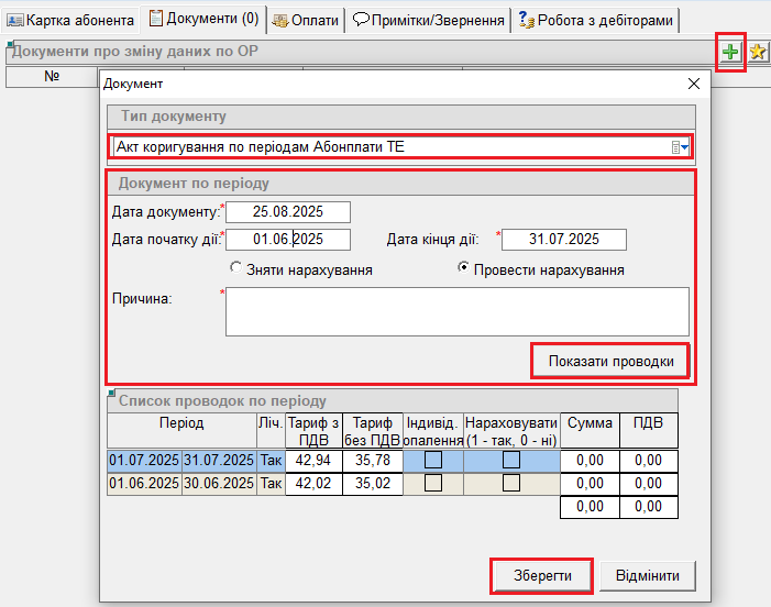 - вибрати тип документу "Акт коригування по періодам Абонплати ТЕ":