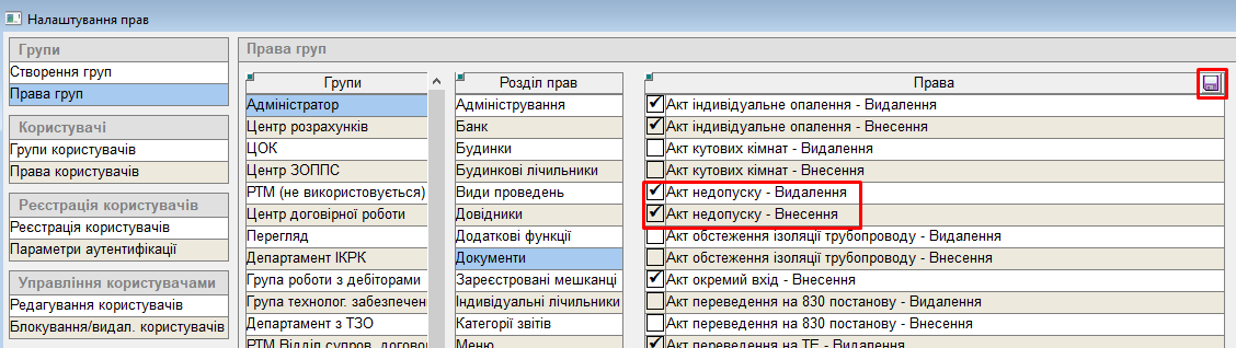 Для створення або видалення "акту недопуску", користувачу мають бути надані такі права: