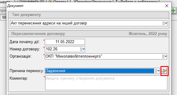 - вибрати “Тип документу” - "Акт перенесення адреси на інший договір":