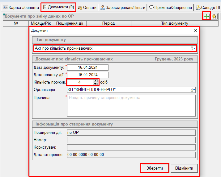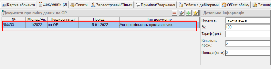 - після цього у вкладці "Документи" буде відображений заведений документ "Акт про кількість проживаючих":