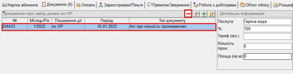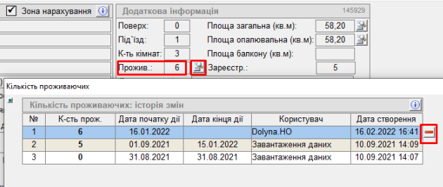 Якщо документ про зміну кількості проживаючих було заведено в минулому розрахунковому місяці, для видалення можна скористатись тут кнопкою "-" , видалення відбувається почергово;