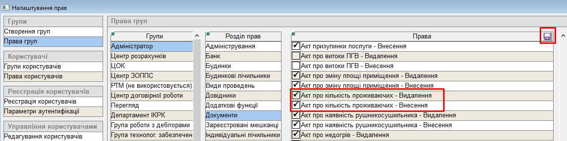 Для створення або видалення "акту про кількість проживаючих", користувачу мають бути надані такі права: