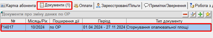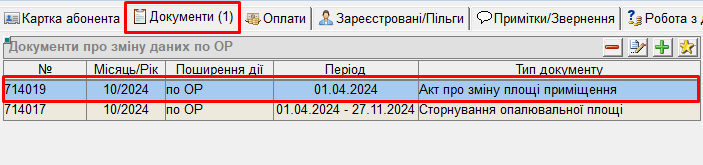 - після цього, у вкладці "Документи" буде відображено заведений документ "Акт про зміну площі приміщення":