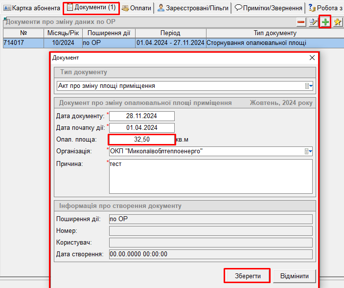 За потреби, можна створити новий акт зміни опалювальної площі за минулий розрахунковий місяць (або, наприклад, з датою початку дії, яка була у сторновоному акті, на нашому прикладі ми сторнували вище акт який діяв з дати 01.04.2024):