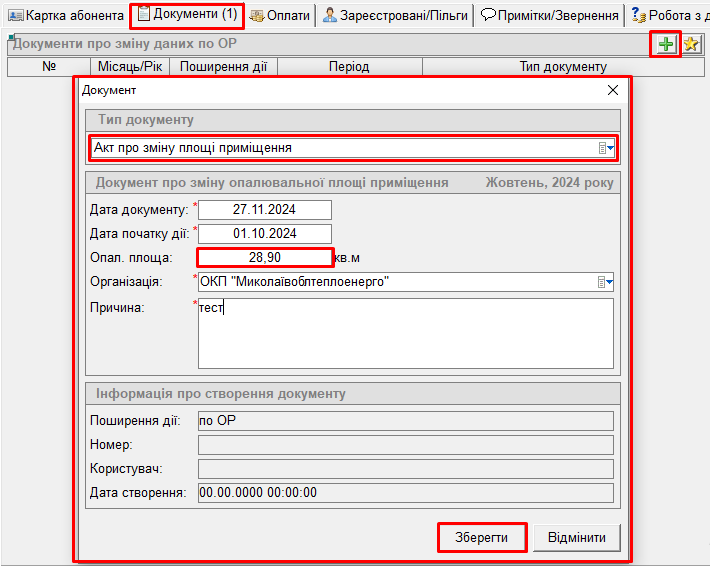 Щоб змінити опалювальну площу по ОР, - потрібно створити "Акт про зміну площі приміщення". Для цього: