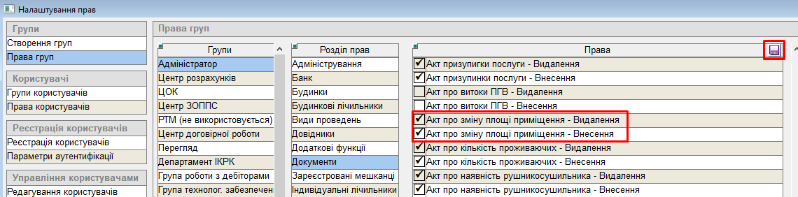 Для створення або видалення "акту про зміну площі приміщення", користувачу мають бути надані такі права: