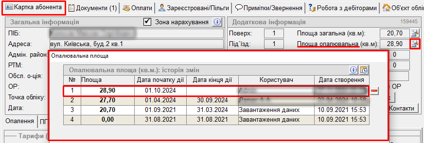 - у картці ОР, - потрібно відкрити вікно з історією змін опалювальної площі;