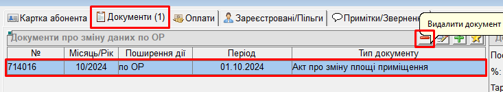 Для видалення "акту про зміну площі приміщення", заведеного у поточному розрахунковому місяці: