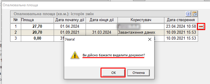 - і, навпроти запису з останньою зміною по опалювальні площі, натиснути кнопку мінус "-":