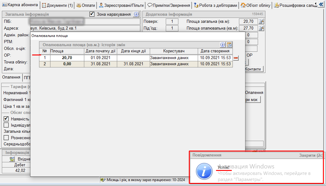 - після видалення акту, у нижньому правому кутку екрана висвітиться повідомлення "Успіх", і також, у вікні з "історією змін опалювальної площі" бачимо що вибраний запис видалився: