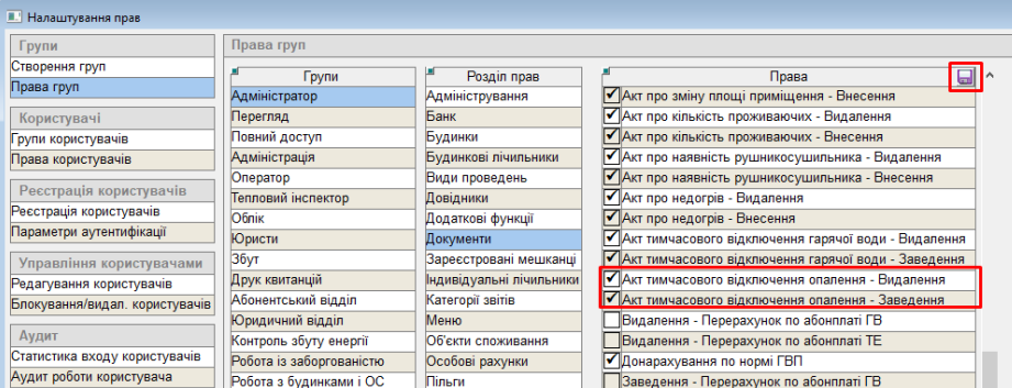 Для створення або видалення "акту тимчасового відключення опалення", користувачу мають бути надані такі права: