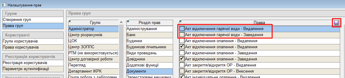 Для створення або видалення "акту відключення гарячої води", користувачу мають бути надані такі права:
