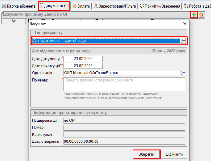 - вибрати “Тип документу” - "Акт відключення гарячої води":