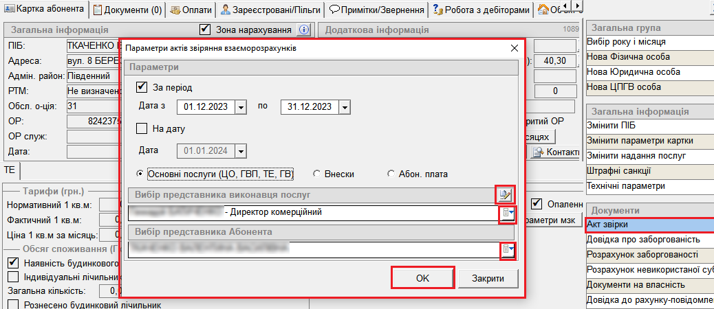 Акт звірки — при виборі цього пункту відкриється вікно "Параметри актів звіряння взаєморозрахунків":