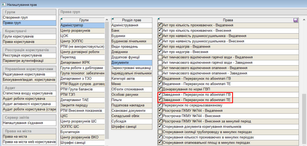Права такі самі як і для заведення актів Перерахунок по абонплаті ТЕ/ГВ: