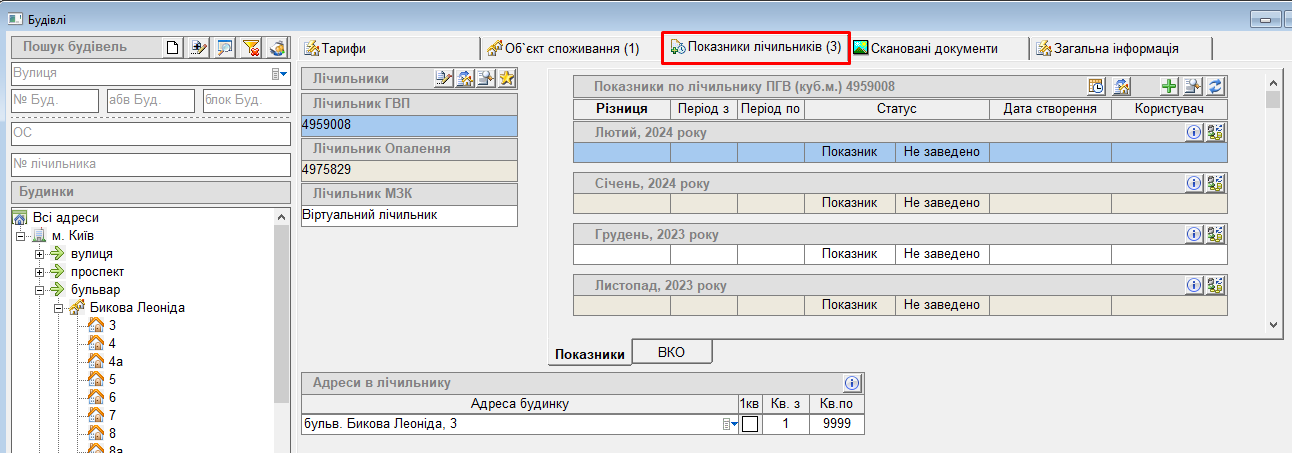 Для роботи з будинковими лічильниками:відкрити потрібний будинок, та перейти на вкладку "Показники лічильників": Робота з будинковими лічильниками