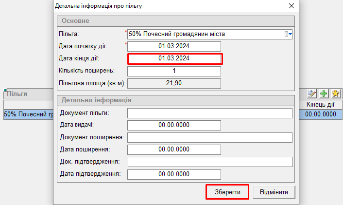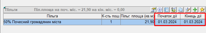 - "дату кінця дії" вказати таку ж як "дата початку дії пільги";