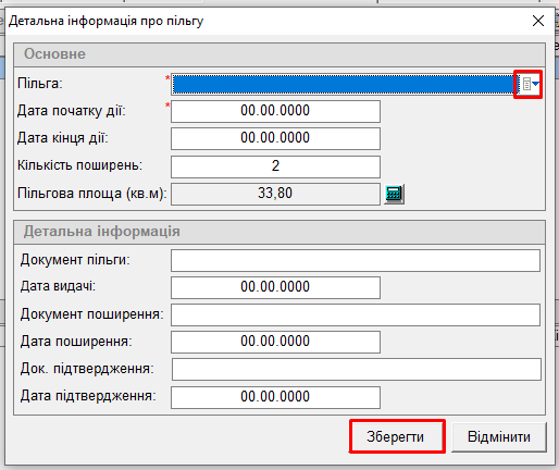 - пільгова площа — площа, на яку діє дана пільга (натиснути на кнопку "калькулятор");