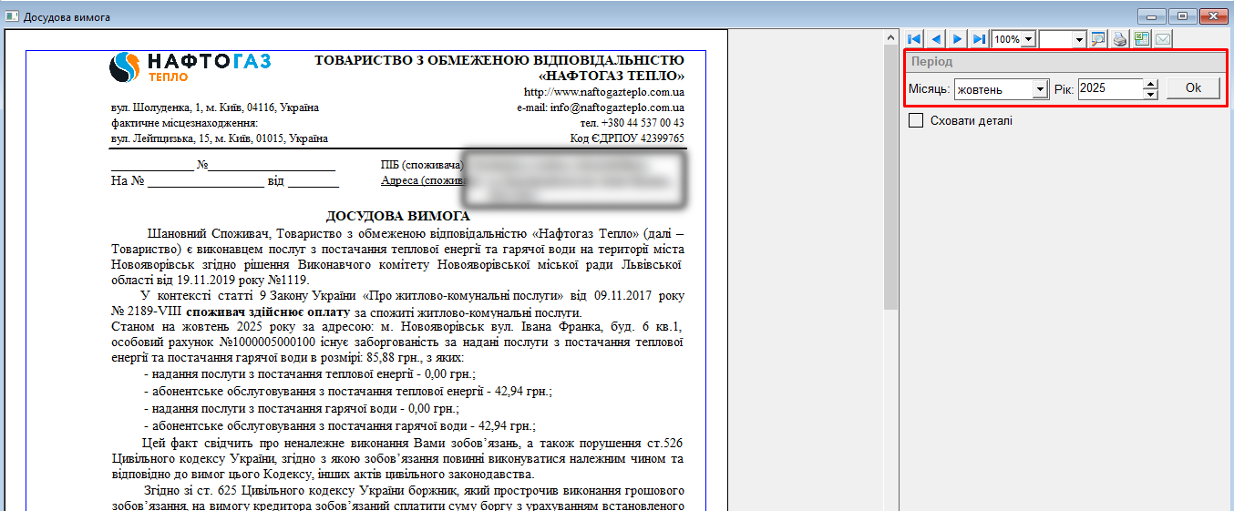 Якщо за обраний період загальна сума по послугам 0 або переплата, досудова вимога у такому випадку не формується.