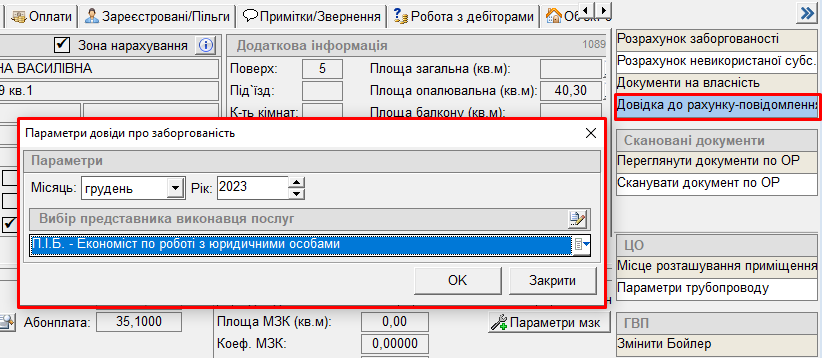 Довідка до рахунку-повідомлення:вибрати місяць та представника, натиснкути "ОК" - сформується довідка до рахунку-повідомлення: Довідка до рахунку-повідомлення Довідка до рахунку-повідомлення