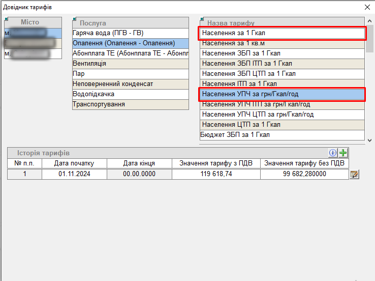 - та двоставковий тариф (населення УПЧ(умовно-постійна частина) за грн/Гкал/год)