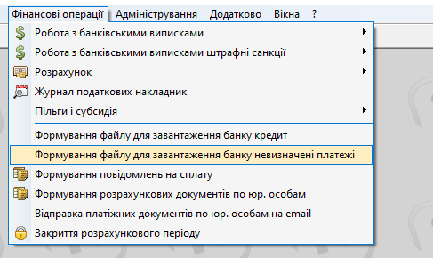 перейти в Фінансові операції — Формування файлу для завантаження банку невизначені платежі: