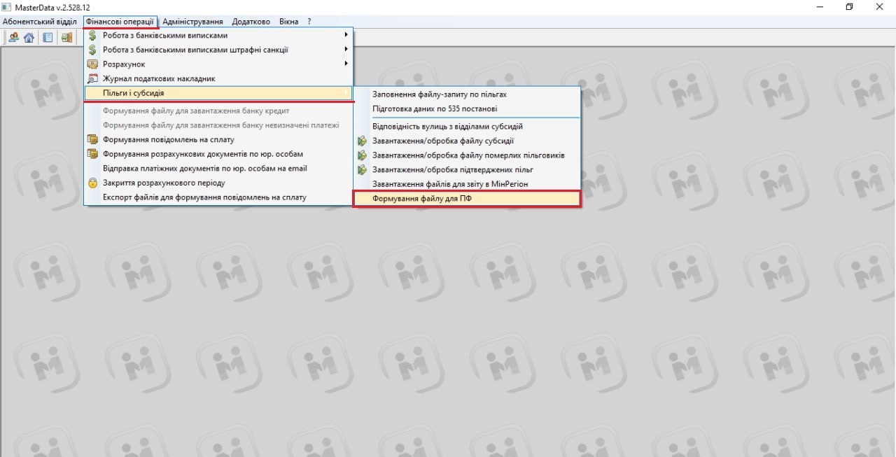 Фінансові операції - Пільги і субсидія - Формування файлу для ПФ: