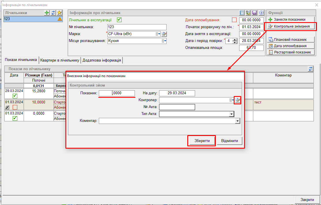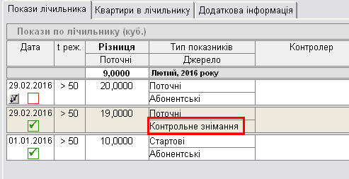 Далі, у показах лічильника з'явиться новий показник, і у колонці "Тип показників/Джерело" буде вказано "Контрольне знімання":