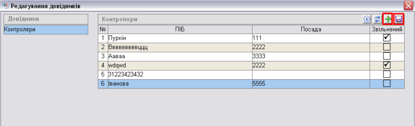 щоб додати контролера у довідник контролерів, натиснути кнопку "листок з ручкою", далі на кнопку "+", Записуємо ПІБ, посаду, далі "Зберегти" (дискета). Якщо контролер звільнений, у графі "звільнений" ставимо галочку — і нажимаємо зберегти "дискета", далі закриваємо вікно: