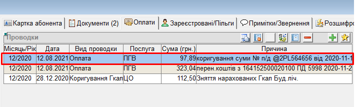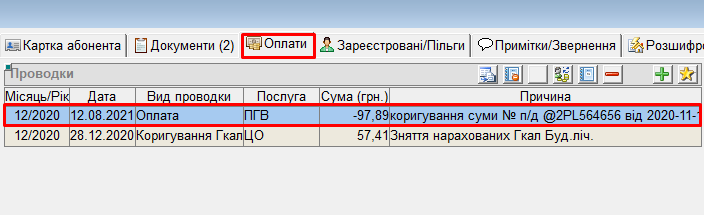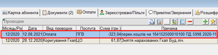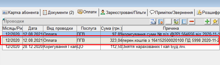 - і на ОР, з якого перенесли платіж, буде створена відповідна проводка у вкладці “Оплати”: