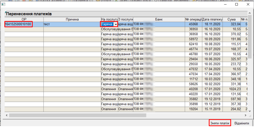 - у блоці “Банк” натиснути кнопку “Перенесення”, відкриється вікно у якому вказати ОР на який переносимо платіж, Причину, на яку послугу, та натиснути “Зняти платіж”: