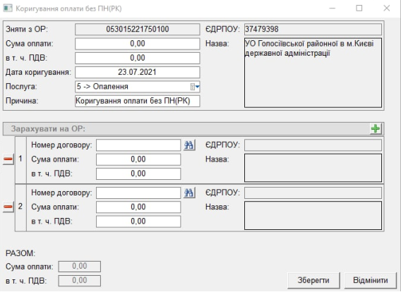 В нижній частині вікна у полі «Разом» - відображається різниця між Сумою оплати та ПДВ у блоці «Зняти з ОР» та Сумою оплати та ПДВ усіх зарахувань у блоці «Зарахувати на ОР»