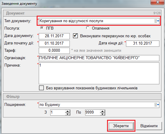 - Вибрати тип документу "Коригування по відсутності послуги";- вибрати послугу;- заповнити інформацію , та натиснути Зберегти: Заведення документу