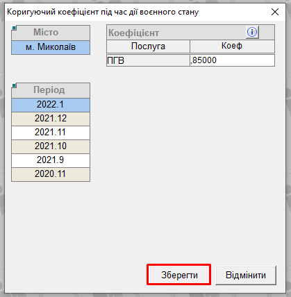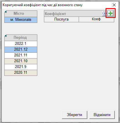 даний коефіцієнт можливо внести тільки у поточний місяць, натиснути “+”, вказати коефіцієнт та натиснути Зберегти: