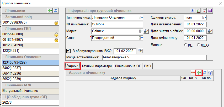- далі потрібно додати Адреси в лічильник, для цього вибрати вкладку "Адреси" і натиснути кнопку "+":