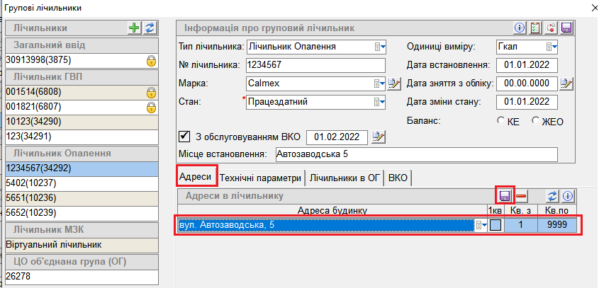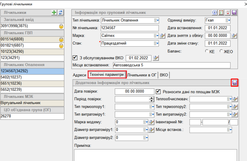 - після заповнення інформації про лічильник натиснути кнопку "дискета" для збереження: