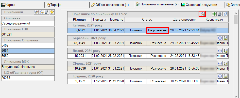 - Після збереження, дані про показник будуть відображені у вкладці "Показники лічильників", статус показника вказано "Не рознесено", - щоб рознести показник, натиснути на кнопку "Будинок зі стрілочкою":