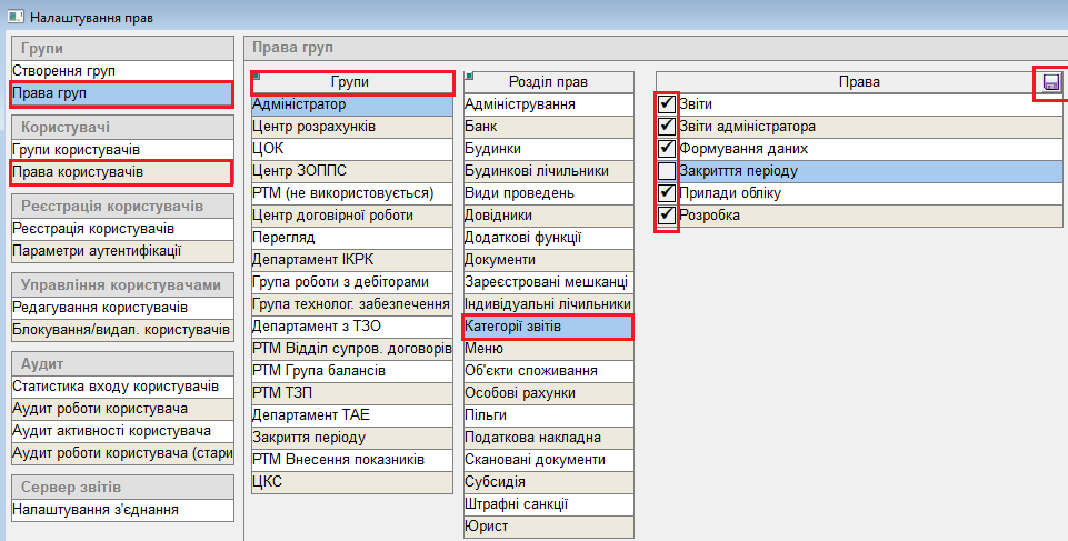 Щоб подивитись застосовані зміни, які зробили у налаштуванні прав, - натиснути кнопку "звіти":
