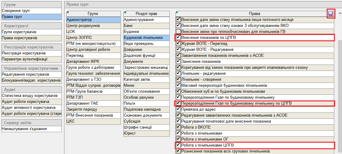 1) Права для роботи з лічильниками ЦПГВ: