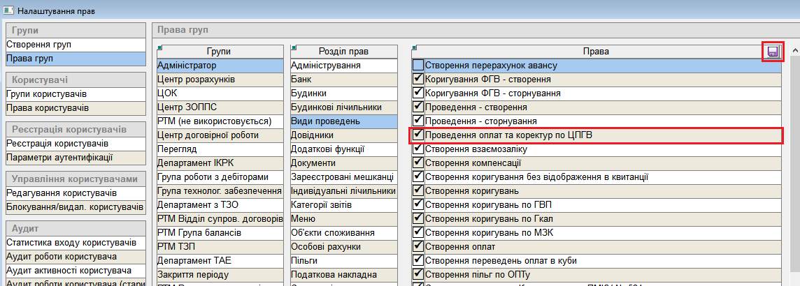 2) Права для проведення оплат та коректур по ЦПГВ: