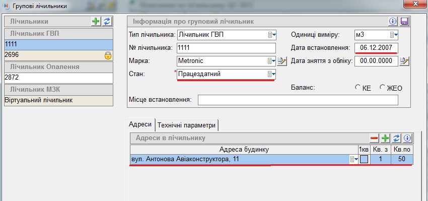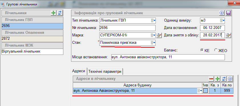 Закрити лічильник: обрати "стан" — помилкова привязка, дата зняття з обліку — вказати останню дату, по яку знято показник, далі "Зберегти"(Дискета):