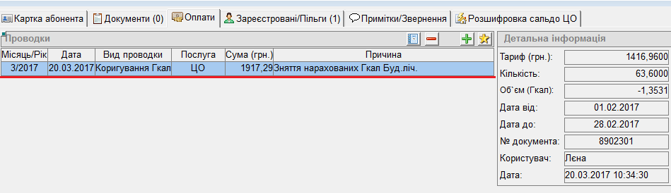 В картці ОР (даного будинку, по якому робили обнулення показника будинкового лічильника), у вкладці "Оплати" буде створена проводка"Коригування Гкал":