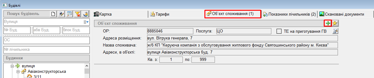 2. Вибрати потрібний будинок, перейти на вкладку “Об’єкт споживання”, натиснути кнопку “+” :