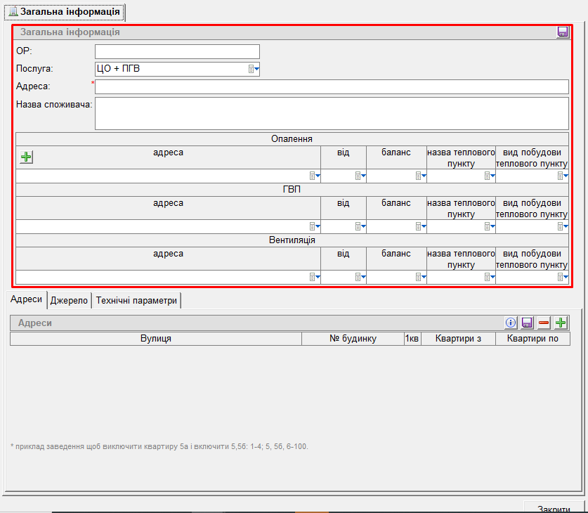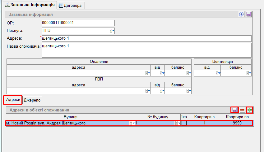Далі у вкладці “Адреси” натиснути кнопку “+”, проставити Адреси в об’єкті споживання, та натиснути кнопку “дискета” (зберегти).