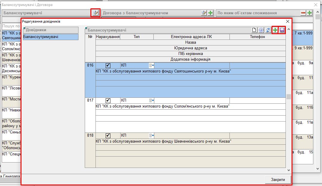 у блоці “Балансоутримувачі” натиснути кнопку “листок з ручкою”, відкриється довідник балансоутримувачів, у якому можна заводити/редагувати балансоутримувачі. Після внесення змін, натиснути дискету для збереження: