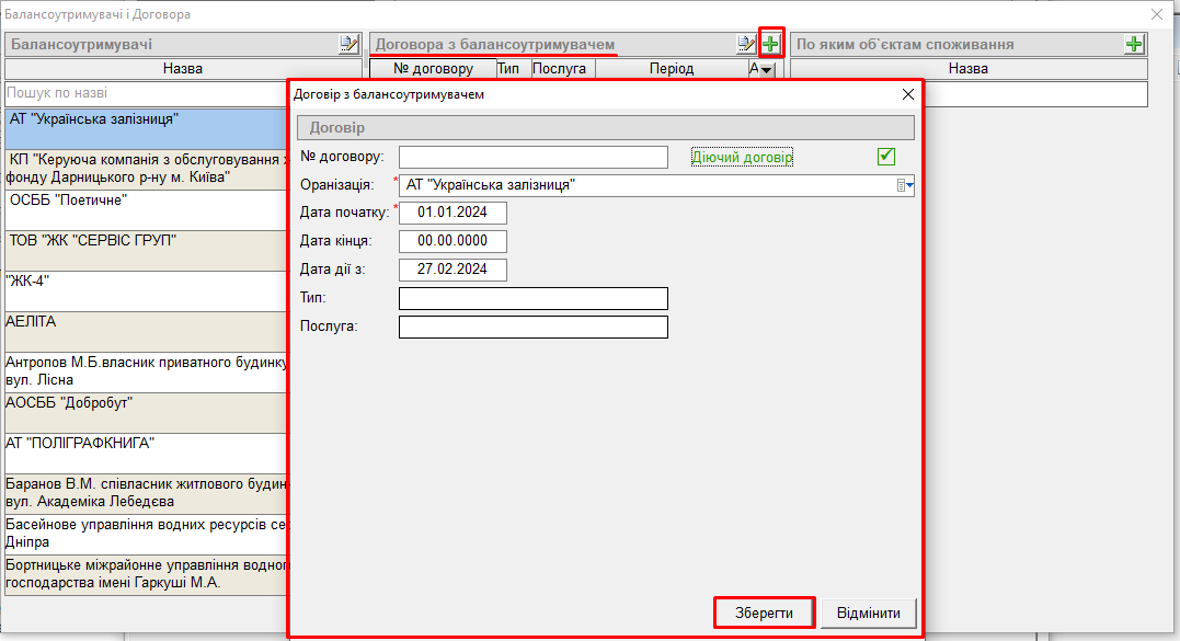 далі, у блоці "Договора з балансоутримувачем" натиснути кнопку "листок з ручкою", відкриється вікно для заповнення інформації про договір: