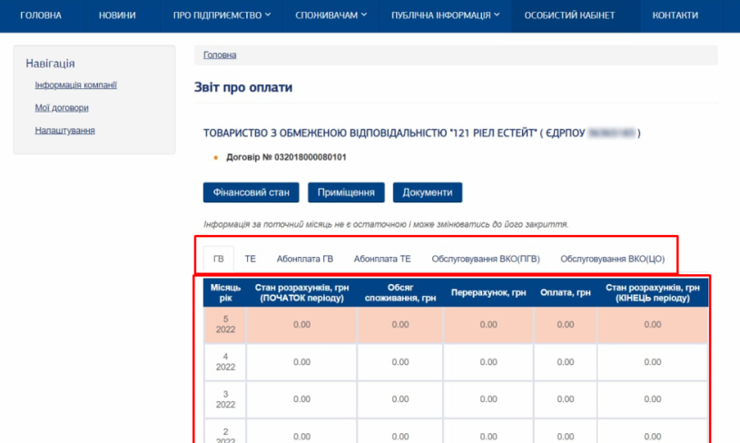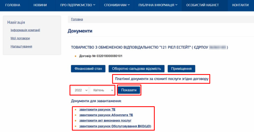 4) Натиснувши на “Документи” відкриється вікно, де можливо завантажити платіжні документи за обраний місяць по обраному договору: