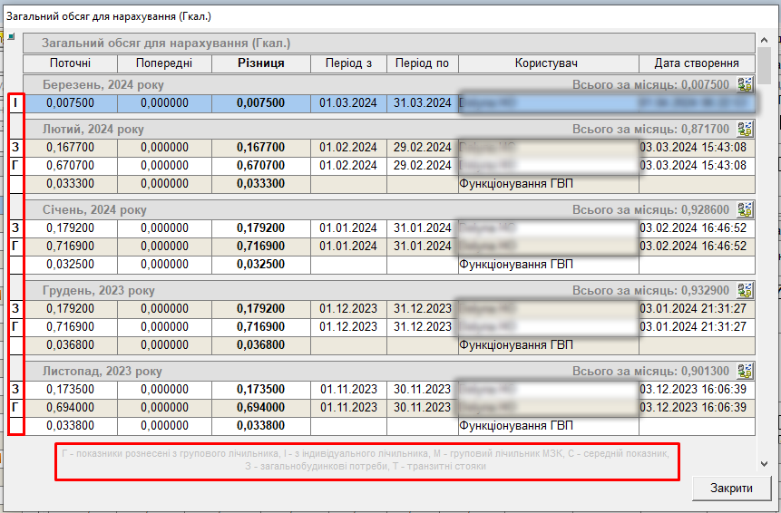 Знизу у вікні показано розшифровку признаків показників (Г, І, М, С, З, Т)